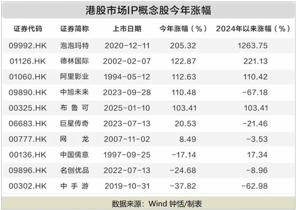 泡泡玛特的疯涨也带火了港股IP概念板块,传闻中为其代工的德林国际今年累计涨幅超1.22倍,布鲁可、阿里影业、巨星传奇等近期股价也明显异动。