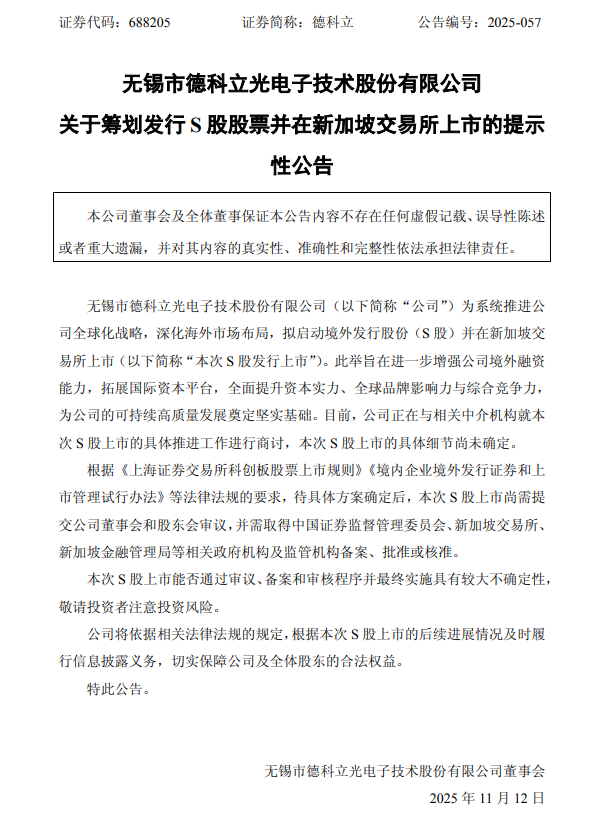 11月11日,德科立(688205.SH)公告,公司为推进全球化战略,深化海外市场布局,拟启动境外发行股份(S股)并在新加坡交易所上市。